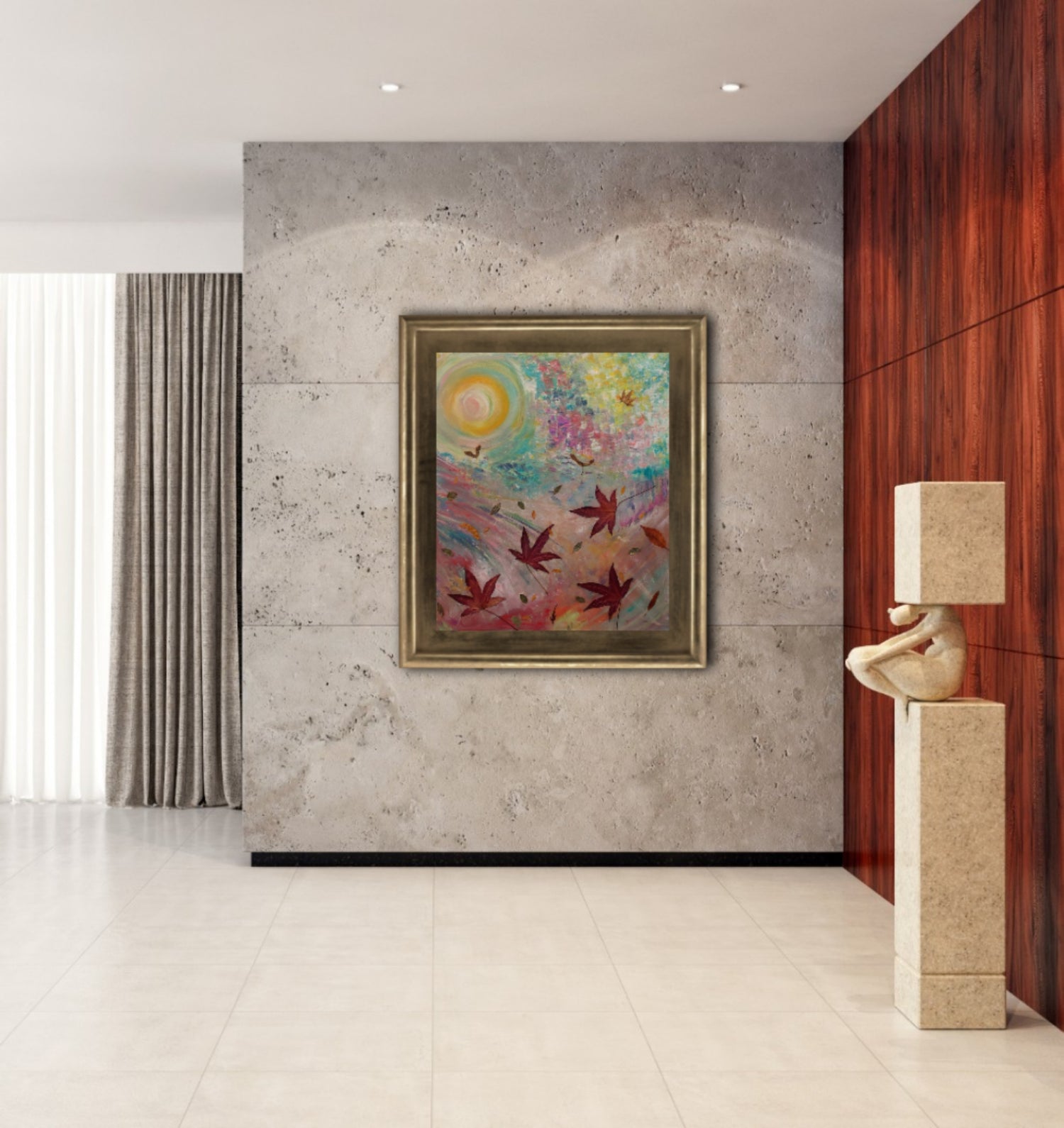 "The Dance" stands as a captivating piece within a larger collection, each painting a testament to the profound connection between humanity and the natural world. Set against the serene backdrop of St. Anne's Park in Dublin, this series of four paintings, including "The Dance," unfolds as a symphony of colors and forms, each piece building upon the themes of intuition, liberation, and the timeless rhythm of nature.